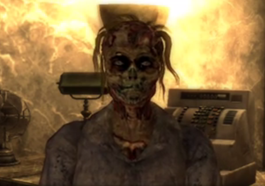 Carol started life as a regular human, but when nuclear Armageddon struck she was turned into a ghoul, a common subset of homo sapiens that are all afflicted with long life, rasping voices and decaying skin. They’re sometimes referred to as “zombies” by regular folk, and it’s not hard to see why. If I couldn’t scratch my ear for fear of it coming off in my hand, I’d start finding work with Romero myself.